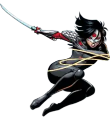 Takeo spent days preparing himself before taking both swords to the Yamashiro residence, demanding his brother duel for the "prize" of Tatsu.[4] During the course of the struggle, a fire was started, and—while Maseo was distracted by his children—Takeo killed his brother with the sword which would become known as "Soultaker". Tatsu arose just in time to see her husband die and engaged Takeo, gaining the upper hand and disarming him. Attempting to save her children, she heard her husband's voice coming from the sword, telling her they were already lost. Escaping with her life, Tatsu began training as a samurai under a master called Tadashi. After much time she graduated from his tutorship and left for America where she intended to use her talents to fight for justice. She took the codename Katana after the sword that she wielded, possessed for some time by the soul of her husband.[4][6]