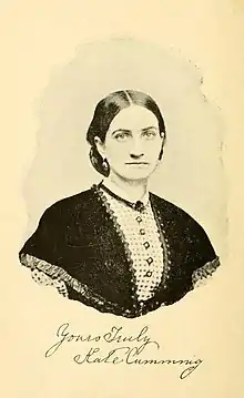 Born in Edinburgh, Scotland, her family left the United States when Cumming was still young, settling finally in Mobile, Alabama.[2][3] At the outbreak of the Civil War, Cumming's mother and two sisters left for England, leaving Cumming behind with her father and brother.[1] Against her family's wishes, in April 1862, Cumming volunteered as a nurse in a Confederate hospital located in Corinth, Mississippi, near the location of the Battle of Shiloh after her brother enlisted in the 21st Alabama Infantry.[4][5] She was inspired to serve by Florence Nightingale as well as Reverend Benjamin M. Miller, who called women specifically to aid the Confederacy.[2]