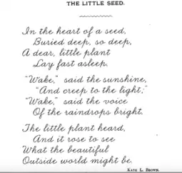 Kate Louise Brown (May 8, 1857[1] – December 31, 1921) was a children's educator and author who wrote 17 works in a total of 41 publications,[2] in addition to poems, songs, and magazine articles.[2] She is best known for the books, The Plant Baby and Its Friends, Little People, Alice and Tom, and Stories in Songs.[1]