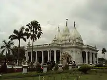 Adinath Temple also known as Paresh Nath Temple or Kathgola Temple is situated in the Kathgola Gardens. It is a temple dedicated to Bhagawan Adishvar. Moolnayak of this temple is a 90 cm. white colored idol of Bhagawan Adishvar padmasana posture. The idol of Bhagwan Adinatha is very ancient and considered to be around 900 years old. There are 17 other images of Jain Tithankaras and other deities.[2] This temple was built in 1933 by Lakshmipat Singh Dugar due to inspiration from his mother. The architecture of the temple is unique of its kind.[3] A dadabari dedicated to jain saint Jinadutta Suriji Maharaj is present near the Adinath Temple. The dadabari contains a pair of Charans of Guru Jinadutta Suriji Maharaj, and was built at the same time as the main temple.