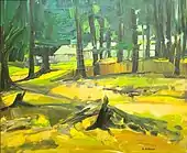 Morris painted scenes of urban and pre-industrial rural Quebec[lower-alpha 2] not in support of a French Canadian identity but to suggest that the "primitive" could provide a sanctuary from modern life.[15] From the first, deeply textured, strokes of her early works, to the gentle swoops of colour and line in her later landscapes, Morris exhibited a unique style that set her apart from her contemporaries. She painted from sketches, in which she simplified the forms and applied colour in bold, thick patches. Her subject matter reflected her kinship with her surroundings and an appreciation of the simple life. She also felt deeply for the animal world, voicing her concerns publicly to protest the annual seal hunt. Throughout her life, she spent two months of every summer in Marshall's Bay near Arnprior, Ontario, at a small secluded cottage that had been in the family for over a hundred years. There she would paint the fields and sunsets or indulge in her love for animals by painting cows and sheep.[lower-alpha 3] However, since exhibitors preferred her town rather than her country scenes, most of her time was spent developing her winter sketches into larger canvases.[16]