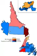 On election night the Progressive Conservatives won 37 of the province's 48 seats, six fewer seats then the party held before the election. The Liberal Party won six seats, while the NDP were elected in five.[48] With this win Dunderdale became only the third female in Canadian history to lead a party to victory in a general election, after Catherine Callbeck in Prince Edward Island and Pat Duncan in the Yukon.[9]