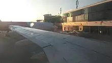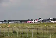 The airport's concrete runway is 3200m by 45m, oriented 9 and 27, and can accommodate aircraft as large as Boeing 747 or Boeing 777, albeit not at MTOW.[18] Heavy transports such as Antonov An-124[19] or An-225[20][21] have been noted to land there on occasions. The airport uses new generation Instrument Landing System, a Thales 420 system.[22] The runway at Katowice Airport is the second longest runway in Poland, behind Warsaw Chopin's runway 15/33. 33 new aircraft stands are under construction as of now. They will be located between taxiways E (Echo) and H (Hotel), to the west from main apron, between main and cargo apron and to the east from cargo apron.