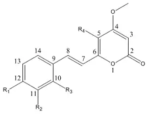 A total of 18 different kavalactones (or kavapyrones) have been identified to date, at least 15 of which are active.[33] However, six of them, including kavain, dihydrokavain, methysticin, dihydromethysticin, yangonin, and desmethoxyyangonin, have been determined to be responsible for about 96% of the plant's pharmacological activity.[33] Some minor constituents, including three chalcones, flavokavain A, flavokavain B, and flavokavain C, have also been identified,[33] as well as a toxic alkaloid (not present in the consumable parts of the plant[34]), pipermethystine.[35] Alkaloids are present in the roots and leaves.[36]