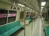 A mock-up was manufactured in Japan after Kawasaki Heavy Industries won the contract.[21] It was shipped to Singapore and put on public display during the 1984 National Exhibition held in November 1984 at World Trade Centre.[21] The mock-up featured three choices of seating arrangements and colour schemes; members of the public were invited to give feedback on these options.[21] The finalised interior design of the C151 trains consisted of a fully longitudinal seating arrangement.[22] The bucket seats were made of plastic; glass partitions separated the seating areas from the passenger doors.[22] Strap lines for standing passengers were installed in the middle of every car.[22] The colour scheme of each adjacent car's interior is distinct to make car identification in cases of fault reporting easier for passengers.[22] Originally the colour scheme of the driving trailer cars was orange, that of the second and fifth motor cars was blue, and that of the two centre motor cars was green.[2] There were nine seats between two doors; this was reduced to seven after the first round of refurbishment.[22]