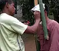 The major religious festival is the three-day Kay Htein Bo festival, which commemorates the belief that the creator god gave form to the world by planting a small post in the ground. During this festival, held in late March or early April, a Kay Htoe Boe pole is erected and participants dance around the pole.[13][15] This festival is held to venerate the eternal god and creator messengers, to give thanks for blessings during the year, to appeal for forgiveness, and pray for rain. It is also an opportunity for Kayan from different villages to come together to maintain the solidarity of the tribe.