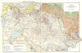 NTD of the area along ethnic lines had been proposed as early as 1920.[8][9] In Tsarist times the general area of modern Kazakhstan was composed of four regions (oblasts); west-to-east these were Ural (plus part of Transcaspian Oblast, Turgai, Akmolinsk and Semipalatinsk. All four oblasts had been created by a Decree of Tsar Alexander II of October 21 ( November 2) 1868.[10] On 26 August 1920 the Kirghiz Autonomous Socialist Soviet Republic (KASSR, located within the Russian Soviet Federative Socialist Republic, RSFSR) was created from these four provinces (briefly joined together in this period in the short-lived Alash Autonomy), with the northern border of the ASSR essentially following that of the former four oblasts, though adjusted in places to reflect local demographics, however disputes over specific areas of the boundary continued into the following year.[11] Note that at this time Kazakhs were referred to as ‘Kyrgyz’ and what are now the Kyrgyz were deemed a sub-group of the Kazakhs and referred to as ‘Kara-Kyrgyz’ i.e. mountain-dwelling ‘black-Kyrgyz’).[12][13] The areas west of the Ural river associated with the Kazakh Bukey Horde were claimed by both the KASSR and Astrakhan Oblast, with most of the area going to the KASSR in 1921, including Kurmangazy and Sinemorsk.[14] Elsewhere, some Russian-inhabited areas of the four oblasts, such as Omsk, were transferred to Russia.[15][16][14]