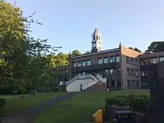 Located in North Staffordshire, Keele's campus is rural with many 19th-century architectural features such as Keele Hall predating the concrete and red-brick buildings of the modern university.[49] The campus occupies a 625-acre (250 ha) rural campus close to the village of Keele and consists of extensive woods, lakes and Keele Hall set in Staffordshire Potteries. The estate was originally given by King Henry II of England to the Knights Templars in 1180. When the Templars were condemned and dissolved by the Council of Vienne in 1311, their possessions were annexed by the Knights Hospitallers until their dissolution by Henry VIII.[50] The estate was purchased from the Crown by the Sneyd family and remained their property until acquisition by the Stoke-on-Trent Corporation in 1948. Apart from increasing numbers of academic and residential buildings, other facilities include an astronomical observatory, arts and cultural programme, arboretum, Islamic centre, shops, cafés and places to eat and drink. The campus has science, business enterprise parks and conference centres. It is home to the Earth Science Education Unit (ESEU).[51] The chapel is located in the centre of the campus, close to the university library and student union. From the onset, Christian worship was central to University life. Lindsay, first principal of the University College, was an ardent Christian preaching every Sunday in the Library Reading room of Keele Hall.[52] A permanent structure was required and the chapel was built in 1965. Built from Staffordshire blue brick, the chapel accommodates different Christian traditions.