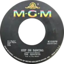 In 1965, the song was covered by The Gentrys.[2] The Gentrys' version was first released on Youngstown 601 in 1965, but was soon nationally distributed by MGM Records.[3] "Keep On Dancing" is notable for the fact that it is actually one short recording repeated in order to stretch the record out to the length of the typical pop single of its day. The second part of the song (after the false fade, beginning with Gentrys drummer Larry Wall's drum fill) is the same as the first.[4] Although the Gentrys usually had Jimmy Hart and Bruce Bowles as singers, the band's guitarist, Larry Raspberry, sang lead vocals on the song.[5]