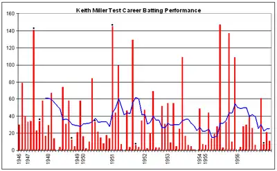 A member of the record-breaking Invincibles, at the time of his retirement from Test cricket in 1956, Miller had the best statistics of any all-rounder in cricket history.[5] He often batted high in the order, sometimes as high as number three. He was a powerful striker of the ball, and one straight six that he hit at the Sydney Cricket Ground was still rising when it hit the upper deck of the grandstand. Miller was famous for varying his bowling to bemuse batsmen: he made sparing use of slower deliveries and would often adjust his run-up, surprisingly bowling his fastest deliveries from a short run. He was also a fine fielder and an especially acrobatic catcher in the slips.[6]