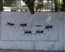 Among the images stenciled by Keizer in public spaces in Egypt are images of ants. The artist writes on his website that "The ant symbolizes the forgotten ones,the silenced, the nameless,those marginalized by capitalism. They are the working class,the common people,the colony that struggles and sacrifices blindly for the queen ant and her monarchy. Ants are devoted,dedicated workers,they cooperate, organize,delegate,and put themselves first in the line of danger and duty. Under appreciated and ruled,they receive and expect no reward for their efforts,toil and struggle..."