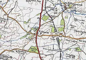 Kelmarsh railway station on the Northampton and Market Harborough railway opened on 16 February 1859 serving the villages of Kelmarsh and Arthingworth, Northamptonshire, England. It ran almost equidistant between the two villages which are just under 2 miles (3.2 km) apart north-east of Kelmarsh and south-west of Arthingworth. It was part of the London and North Western Railway.[1] The next station north, Clipston and Oxendon serving the villages of Great Oxendon and Clipston was situated south of Oxendon tunnel. To the south, Lamport was accessed via Kelmarsh tunnel.