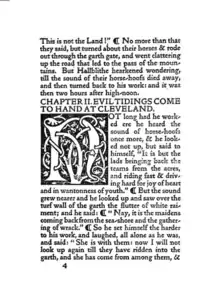 Some of the Kelmscott books are heavily decorated, with motifs similar to Morris's other designs for upholstery and wallpaper. In 1913, Holbrook Jackson wrote: "The Kelmscott books look not only as if letter and decoration had grown one out of the other; they look as if they could go on growing."[43] The title pages of Kelmscott books were usually decorated in a Victorian style.[31] Morris initially designed woodblock initials that were too dark or too large for the pages they appeared on, but later became more proficient in proofing his capitals.[44] The Kelmscott books varied greatly in ornaments; while The History of Godefrey of Boloyne is "over-decorated,"[45] the first few books published by Kelmscott were sparsely decorated. Morris's border and capital designs were very similar to his wallpaper designs, and were not illustrative of the texts they adorned. While medieval texts had delicate illuminations covering their margins, the woodcuts Morris made in imitation of them were very heavy, and created production problems in the Chaucer, requiring the hand press to be reinforced with steel because of the weight of the large ornaments. [46] At times Morris preferred that his engravers replicated his designs exactly, even though this was at odds with John Ruskin's theory that craftsmen should have influence in the final aesthetic product they help produce.[47] Kelmscott books did not have printing on the reverse side of woodblock pages until the Chaucer, but this separation of text from illustration was precisely what Morris wanted to avoid in his book designs.[48]