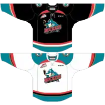 Since 2000, the Rockets' uniforms have featured a logo resembling the legendary Okanagan Lake monster, Ogopogo. Their current third jersey features the monster's head, taken from their shoulder patch design. The team's colours are jaguar teal, athletic red, copper gold, orange sun, black and white. In 2009, their jerseys were slightly modified to fit the Reebok Edge system.[4]