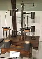 The Kelvin water dropper, invented by Scottish scientist William Thomson (Lord Kelvin) in 1867,[1] is a type of electrostatic generator. Kelvin referred to the device as his water-dropping condenser. The apparatus is variously called the Kelvin hydroelectric generator, the Kelvin electrostatic generator, or Lord Kelvin's thunderstorm. The device uses falling water to generate voltage differences by electrostatic induction occurring between interconnected, oppositely charged systems. This eventually leads to an electric arc discharging in the form of a spark. It is used in physics education to demonstrate the principles of electrostatics.