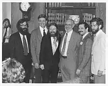 In 1969, Iverson and the APL group inaugurated the IBM Philadelphia Scientific Center.[28][38] In 1970 he was named IBM Fellow.[48] He used the funding that came with being an IBM Fellow to bring in visiting teachers and professors from various fields, including Donald McIntyre from Pomona[27] and Jeff Shallit as a summer student.[23] For a period of several months the visitors would start using APL for expositions in their own fields, and the hope was that later they would continue their use of APL at their home institutions.[49] Iverson's work at this time centered in several disciplines, including collaborative projects in circuit theory, genetics, geology, and calculus.[50][51][52][53] When the PSC closed in 1974,[28][33] some of the group transferred to California while others including Iverson remained in the East, later transferring back to IBM Research. Iverson received the Turing Award in 1979.[1]