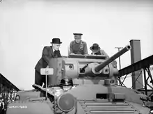 ![]() Brigadier Kenneth Stuart, pictured here on 27 May 1941, in the first Valentine tank built in Canada. | |