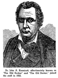 Kennicott was the only physician in a wide circuit, at least 10 miles (16 km) in radius from The Grove. In the early 1840s, with his son Charles, Kennicott planted the first commercial nursery in the area. Botany increasingly became an interest for Kennicott, and he planted every kind of shrub that he could find during his travels. After co-founding the Illinois State Agricultural Society, Kennicott began to provide nurserymen with free scions from varieties grown at The Grove.[5] Kennicott died at his home on June 4, 1863.[5]