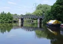 The GWR transported each completed bowstring from Tipton to Kennington by rail on a pair of Pollen C four-wheeled wagons. At the bridge site each bowstring was lifted into place by two rail-mounted 36-ton cranes.[5] When the new bridge was completed, the railway was realigned for a distance of 10 chains (200 m) either side to cross the new bridge.[2] The old bridge was then dismantled and its piers and temporary trestles demolished.[4]