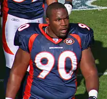 On October 11, 2006, Peterson signed with the Denver Broncos. He was suspended for the first four games of the 2007 season for violating the NFL's steroid policy.[1] During 2007 the Broncos released him twice but decided to re-sign him each time. On March 4, 2009, Peterson re-signed with the Broncos on a three-year contract.[2] He was cut once again on March 10, 2010.[3]