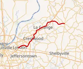 The route is known as New La Grange Road to the west of its first rail crossing in Lyndon and as La Grange Road to the east (outside of city limits). Within the Anchorage city limits, the route is known as Ridge Road east of its westernmost rail crossing in Anchorage, and runs coterminously with Park Road to the west of that crossing. A portion of the route in Oldham County is referred to as the Oldham County Parkway.[2] The route runs coterminously with Kentucky Route 393 for a 0.22-mile-long (0.35 km) stretch in Buckner; it is known as Jefferson Street for approximately 1.5 miles (2.4 km) within the city limits of La Grange, and as West Cross Main within the city limits of New Castle until its eastern terminus.