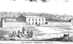 The Kentucky State Penitentiary in Frankfort was the first prison built West of the Allegheny Mountains and completed June 22, 1800 when[1] Kentucky was still virtually a wilderness. The Kentucky Legislature of 1798 had appointed Harry Innes, Alexander S. Bullitt, Caleb Wallace, Isaac Shelby and John Coburn as commissioners to choose a location for a “penitentiary house.” The house was described "to be built of brick, or stone, containing cells, workshops, with an outside wall high enough and strong enough to keep the prisoners from getting away." The site chosen was Frankfort, Kentucky.[2] Henry Innis, one of the commission, gave one acre of land and the legislature appropriated $500 towards its building with more funds to be allocated later.[3]