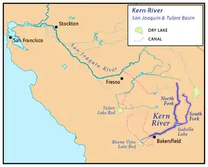 The Kern River formerly emptied into the now dry Buena Vista Lake and Kern Lake via the Kern River Slough, and Kern Lake in turn emptied into Buena Vista Lake via the Connecting Slough at the southern end of the Central Valley. Buena Vista Lake, when overflowing, first backed up into Kern Lake and then upon rising higher drained into Tulare Lake via Buena Vista Slough and a changing series of sloughs of the Kern River. The lakes were part of a partially endorheic basin that sometimes overflowed into the San Joaquin River.[6] This basin also included the Kaweah and Tule Rivers, as well as southern distributaries of the Kings River that all flowed into Tulare Lake.
