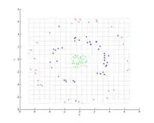 Note in particular that the first principal component is enough to distinguish the three different groups, which is impossible using only linear PCA, because linear PCA operates only in the given (in this case two-dimensional) space, in which these concentric point clouds are not linearly separable.