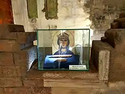 Portions of her relics were clandestinely taken by the St. Augustine Portuguese Catholic missioners, eyewitnesses of her martyrdom, to Georgia where they were interred at the Alaverdi Monastery.[2] The rest of her remains were said to have been buried at the Church of St. Augustine in Goa, India. After several expeditions to Goa in the 21st century to search for the remains, they were believed to be found in late 2013.[3][4][5]