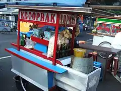 Ketoprak is a typical street food. It was originally popular around the Jakarta area but has spread throughout Java. The seller prepares the ingredients at home and mixes them in front of the customers as they place their orders.[5] It is sold in individual portions from small stalls or carts along the street. The cook usually asks the customer their preference on the degree of spiciness: mild, medium, hot or extra hot. The spiciness corresponds to the amount of chili used. The price range is about IDR 8.000 to 15.000 according to outlets and ingredients included.[6] Sometimes, hard boiled egg might be added.