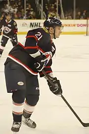 In the 2008–09 season, Porter made the Coyotes opening season roster and made his NHL debut in a 3–1 win against the Columbus Blue Jackets on October 11, 2008, picking up an assist, his first NHL point.[9] Porter scored his first career NHL goal on October 30, 2008, in a 4–1 victory over the Pittsburgh Penguins.[10] At the turn of the year with a reduced role offensively, Porter was assigned by the Coyotes to the AHL for the majority of the remaining season and developed a scoring touch to lead the Rampage in Plus/minus (+7). He finished his first professional season with 5 goals for 10 points in 34 games with the Coyotes.
