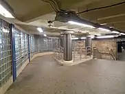 In July 2006, the MTA began work on an $13.9 million project to make the station compliant with the Americans with Disabilities Act of 1990. As part of the project, three elevators were installed in the station, one between each platform and the eastern mezzanine, and one from that mezzanine to the street. A ramp and curbe-glass walls were installed in the passageway connecting the new elevator and the mezzanine. Other improvements that were part of the project included the addition of station agent booths that catered to wheelchair users, as well as new railings, station signs, station payphones, tactile yellow strips along the platforms, and platform fillings to reduce gaps between trains and platforms. The elevator installation was completed in July 2008.[44]