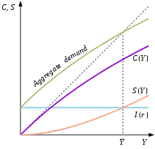 The horizontal blue line I (r ) is the schedule of the marginal efficiency of capital whose value is independent of Y. The schedule of the marginal efficiency of capital is dependent on the interest rate, specifically the interest rate cost of a new investment. If the interest rate charged by the financial sector to the productive sector is below the marginal efficiency of capital at that level of technology and capital intensity then investment is positive and grows the lower the interest rate is, given the diminishing return of capital. If the interest rate is above the marginal efficiency of capital then investment is equal to zero. Keynes interprets this as the demand for investment and denotes the sum of demands for consumption and investment as "aggregate demand", plotted as a separate curve. Aggregate demand must equal total income, so equilibrium income must be determined by the point where the aggregate demand curve crosses the 45° line.[63] This is the same horizontal position as the intersection of I (r ) with S (Y ).