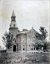 A second courthouse was built not long after the end of the Civil War. In February 1866, a contract was awarded for construction of a two-story brick building with cupola. Built at a cost of $40,000, it served the county until 1973.[14] By the mid-1890s, Keytesville had an estimated population of about 1,100 citizens. Two newspapers, the Chariton Courier and Keytesville Signal, served the community. Businesses included the Keytesville Roller Mill, a large water-powered grist mill on Muscle Fork Creek, two banks, a building and loan association, two hotels, a distillery, general mercantiles and restaurants.[8][9] Because of the town's location 1.5 mi (2.4 km) north of the Wabash Railroad line, Keytesville merchants encouraged the construction, in 1889, of a streetcar line. Hugo Bartz and J. J. Moore, secured land and financing for the project, which when completed consisted of two miles of track and a large barn for horses and rolling stock, constructed for a cost of $10,000.[8] Two horse-drawn passenger coaches and a large flatcar for freight delivered new arrivals at the Wabash depot to the town.