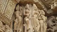 There is iconographic symbolism embedded in the arts displayed in Khajuraho temples.[6] Core Hindu values are expressed in multitude of ways. Even the Kama scenes, when seen in combination of sculptures that precede and follow, depict the spiritual themes such as moksha. In the words of Stella Kramrisch,