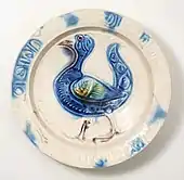 Ceramic styles popular in the Islamic world include lustreware (with a thin metallic film), sgraffiato (in which the design is etched into the slip), and underglaze pottery.[79] Khalili's ceramic collection, numbering nearly 2,000 items, has been described as particularly strong in pottery of the Timurid era and also that of pre-Mongol Bamiyan.[80] As well as bowls, plates, and vases, the ceramics include figurines as well as decorative tiles of the sort used in religious and secular buildings.[79] It includes the earliest known dated ceramic from Iran: a signed fritware bottle dated to 1139–40.[81] Other unique items include a bowl with a depiction of a Buraq, a four-legged creature that is said to have borne Muhammad from Mecca to Jerusalem and then to heaven.[81][82] Laqabi-wares are deeply carved ceramics usually depicting animals or birds; the collection has a Syrian example from around 1200 AD.[83] The wares from 15th-century Iran and central Asia illustrate the connections between Chinese and Islamic pottery. Other collections have a scant coverage of this period.[84]