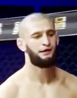 Khamzat Khizarovich Chimaev[1] (Russian: Хамзат Хизарович Чимаев;[5] born May 1, 1994) is a Swedish[6] professional mixed martial artist and freestyle wrestler who competes in the welterweight division of the Ultimate Fighting Championship (UFC).[7] He formerly competed in Brave Combat Federation (Brave CF).[8] In wrestling, Chimaev is a three-time Swedish National champion.[9] As of April 12, 2022, he is #3 in the UFC welterweight rankings.[10]