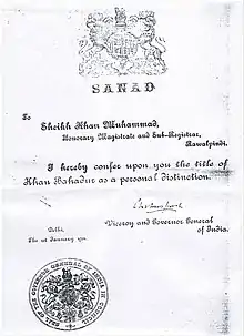 The title was conferred on individuals for faithful service or acts of public welfare to the Empire. Recipients were entitled to prefix the title to their name and were presented with a special Title Badge and a citation (or sanad). It was conferred on behalf of the Government of British India by the Viceroy and Governor-General of India.[1]