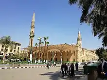 Over many years, space along the Qasaba avenue steadily narrowed as new constructions encroached on it and open spaces disappeared. As the main street became saturated with shops and space for further development there ran out, new commercial structures were instead built further east, close to al-Azhar Mosque and to the shrine of al-Hussein, where some space was still available.[5] Instead of hosting mobile market stalls that were assembled in open spaces, the city's souq areas were progressively replaced by fixed stone structures with built-in spaces for individual shops. This was partly a consequence of the authorities wishing to impose greater control on commercial activities: fixed structures could be counted, taxed, and regulated more easily than makeshift market stalls that could come and go.[5] As the city became denser and space ran out, builders preferred to build multi-storied structures known as a khan (Arabic: خان) or a wikala (Arabic: وكالة), a type of caravanserai (inns for merchants). These types of buildings were centered around an inner peristyle courtyard where merchants could store their goods, while the upper levels were used as living quarters. Their street facades typically had spaces for shops at ground level. In this way, a commercial zone could extend around and between multiple khans.[5][6]