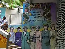 In 1993, the centenary of women's suffrage in New Zealand, a painted 2000-tile memorial and waterfall dedicated to Auckland's and New Zealand women's suffrage movement was installed in the stairway.[1] The suffragists depicted in the memorial are (from left) Amey Daldy, Anne Ward, Lizzie Frost, Matilda Allsopp, Elisabeth Yates, Annie Jane Schnackenberg, Fanny Brown, and Ida Wells.[2]