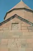 The Nerses chapel, built in the 7th century around the famous pit, was of white limestone.[4] Though plain in appearance, a monastery was built around a large enclosure that surrounds the ruins of the old chapel. This church, known as the Church of the Holy Mother of God (Surb Astvatzatzin), has a twelve-sided tholobate and dome and is dedicated to S. Astvatsatsin. The altar pulpit is well decorated.[5][11] Though most Armenian churches have an east–west orientation, placing the altar at the east end, St. Gevorg Chapel is oriented northwest–southeast.[18]