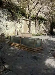 The tomb is placed in an unroofed enclosure. Its headstone is in the middle of the platform. It is convex and has a bulge. On the stone is inscribed in Arabic a quotation from the Qur'an:[3]
