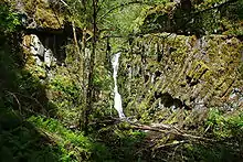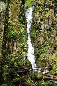 Ki-a-Kuts Falls stands 40 feet (12 m) tall and travels down a narrow rock chute in a single cascade over basalt cliffs.[1][2] They end in a pool of water at the base, with views obscured by trees.[2] Views are further obscured by a bend in the river at that point, which helped keep the falls concealed behind cliffs and thus unnoticed by modern explorers and off of maps.[2] The falls are located 1,700 feet (520 m) upriver (west) of the Tualatin River’s confluence with Maple Creek and 1.4 miles (2.3 km) north of Barney Reservoir at an elevation of 1,299 feet (396 m).[1] This is west of Henry Hagg Lake and the city of Gaston and about 3.5 miles (5.6 km) east of the county line with Tillamook County within the Tillamook State Forest.[1]