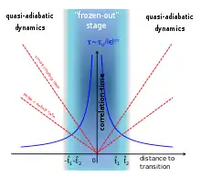 This time scale is often referred to as the freeze-out time. It is the intersection point of the blue and the red curve in the figure. The distance to the transition is on one hand side the time to reach the transition as function of cooling rate (red curve) and for linear cooling rates at the same time the difference of the control parameter to the critical point (blue curve). As the system approaches the critical point, it freezes as a result of the critical slowing down and falls out of equilibrium. Adiabaticity is lost around . Adiabaticity is restored in the broken-symmetry phase after . The correlation length at this time provides a length scale for coherent domains,