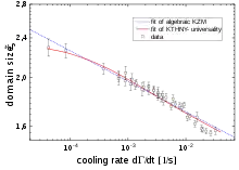 It is characteristic for a continuous phase transition that the energy difference between ordered and disordered phase disappears at the transition point. This implies that fluctuations between both phases will become arbitrarily large. Not only the spatial correlation lengths diverge for those critical phenomena, but fluctuations between both phases also become arbitrarily slow in time, described by the divergence of the relaxation time. If a system is cooled at any non-zero rate (e.g. linearly) through a continuous phase transition, the time to reach the transition will eventually become shorter than the correlation time of the critical fluctuations. At this time, the fluctuations are too slow to follow the cooling rate; the system has fallen out of equilibrium and ceases to be adiabatic. A "fingerprint" of critical fluctuations is taken at this fall-out time and the longest-length scale of the domain size is frozen out. The further evolution of the system is now determined by this length scale. For very fast cooling rates, the system will fall out of equilibrium very early and far away from the transition. The domain size will be small. For very slow rates, the system will fall out of equilibrium in the vicinity of the transition when the length scale of critical fluctuations will be large, thus the domain size will be large, too.[footnote 1] The inverse of this length scale can be used as an estimate of the density of topological defects, and it obeys a power law in the quench rate. This prediction is universal, and the power exponent is given in terms of the critical exponents of the transition.