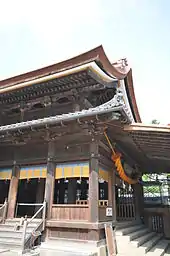 The honden is connected in the front to the haiden by a 1 x 1 bay passage and a short stairway. The haiden's core is just 3 x 1 bays, but it is surrounded on three sides by a 1-bay wide mokoshi (pent roof), bringing the building's external dimensions to 4 x 4 bays.[1] Both entrances to the haiden are on the gabled side (tsumairi style).