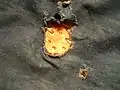 Detail of Edo period kikko katabira (jacket), where the kikko (leather or rawhide) can be seen through a hole in the covering cloth.