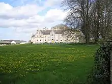 St Bécán, one of the 'Twelve Apostles of Ireland', founded a monastery here in the 6th century, giving rise to the town's Irish name Cill Bheagáin, meaning "the church of St Bécán".[2] In time the monastery fell into disuse and disrepair. A new monastery was founded on the site in 1150, by a member of the Mac Loghlan family, the ruins of the previous one having been rebuilt by the Dalton family. It was subsequently home to Cistercian monks from Mellifont Abbey. The great priest of Clonmacnois, O'Catharnaigh (O'Kearney), died at the monastery in 1196 and Hugh O'Malone, Bishop of Clonmacnois, was buried there in 1236. In 1217 the monastery was involved in the riot of Jerpoint, and the abbot was punished as a result. Following the Conspiracy of Mellifont, the monastery was made subject to Buildwas Abbey. After its dissolution in 1539, the monastery and its extensive lands were granted to the Lambart family. The monastery was subsequently totally demolished and its location was lost. However, the location and full plan of the monastery were uncovered by geophysical survey by Archaeological Projects in 2003 west of the early-medieval graveyard (Hayden 2003). A later parish church was built northeast of the early medieval church and served as the parish church for the reformed Church of Ireland.[4][5] The church is no longer in use. The tower survives, in a ruinous state.