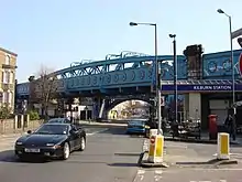 Kilburn serves the area of the name itself, which is a moderate commercial district and dense residential suburb. The place was said to be named after Cylla, then a Saxon, or from the 1121 Saxon term "Cuneburna" for "the cattle stream".[7] The earliest settlements near the station date back to 1847.[8] The station is on the A5 Kilburn High Road or Shoot-up Hill. The road connects several stations including Brondesbury and Kilburn High Road. Nearby landmarks include the Red Lion, Kiln Theatre, Kilburn Grange Park, ICMP London and Kingsgate Primary School.[9]