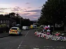 ![]() Tributes left at the police cordon on Chandos Crescent four days after the killings | |